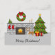 A ilustração original de desenho animado de Destei de um cão da raça Boston Terrier de cor branca e corada bonita. O cão é colocado numa sala festiva que tem uma lareira e muitas decorações de Natal, incluindo uma árvore de Natal verde, algumas meias vermelhas e uma coroa com um arco vermelho. Há também uma área de texto personalizável que agora diz: "Feliz Natal!".