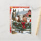 Cartão postal personalizado de Natal. Bonito estilo aquoso ilustração ai de um cavalo marrom, vaca avistada numa fazenda num dia de inverno nevado com um cardeal na cerca rústica e um celeiro vermelho no fundo.