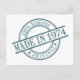 Com um logotipo redondo verde em borracha estilo carimbo com “Cem Por Cento Autêntico” escrito no topo e “Original” na parte inferior, ladeado por estrelas de cada lado, e “Feito em 1974” escrito na frente entre duas linhas em um ângulo, este é o cartão de saudação perfeito para enviar a qualquer pessoa nascida no ano de 1974.
