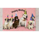 Um grupo de cães animados vestindo chapéus de festa, comemorando um aniversário. Os cachorros são alegres e felizes e brincalhões tendo uma festa feliz.