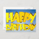 Feliz aniversário. Letras amarelas, design azul do céu.