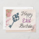 Feliz Aniversário de 21 anos caligrafia em um fundo rosa estilo vitoriano vintage com flores e chave.