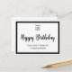 Você pode adicionar seu logotipo na frente deste cartão postal. O logotipo estará acima de um texto que diz Feliz Aniversário. Duas linhas de texto de exibição estão abaixo do texto para sua mensagem personalizada. O cartão postal tem uma borda preta.