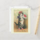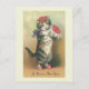 Imagem muito bonito de um carregando de gato, buquê de rosas e letra selada com rosa. Ela tem uma fita roxa ao redor do pescoço, uma coroa de rosas na cabeça e veste pequenos chinelos cor-de-rosa.