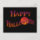 Feliz saudação de Halloween com um morcego espectral voando através de uma lua de outubro de cheio.