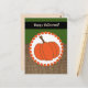 Feliz Dia das Bruxas em um fundo verde e castanho, com uma abóbora laranja. Envie este cartão postal de feriado de outono aos amigos em outubro ou setembro.