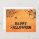 Celebre a estação assustadora com este cartão postal do Feliz Dia das Bruxas em cor de laranja e preto. O design apresenta teias de aranha e rastreadores assustadores, perfeitos para enviar saudações festivas, notas de festas ou mensagens sazonais. O verso é vazio esquerdo para que você possa escrever sua mensagem pessoal manualmente. Uma maneira simples, mas na moda, de compartilhar a alegria do Halloween.