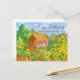 Saudações de cartão postal do Dia de Ação de Graças com uma casa de campo em um ambiente verde exuberante com abóboras maduras e girassóis altos e brilhantes pintados à mão com aquarela. Uma maneira maravilhosa de enviar saudações de feriado para compradores de novas casas e clientes em potencial!