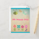 Um design bonitinho e alegre. 4 flores brancas ao longo do fundo e alguns insetos sorridentes bonitos no topo. Entre os insetos está uma abelha-lombo, uma borboleta e uma libélula. O texto no meio diz "oh feliz dia em uma fonte rosa chubby". O fundo é uma textura de papel em marrom-claro que desaparece em verde.