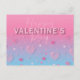 Design de cartão postal com Dia de os namorados de de branco, com cadáveres cor-de-rosa pastel num fundo rosa a azul pastel.