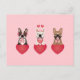 Ilustração de três cachorros franceses do Bulldog de diferentes cores saindo de corações vestidos de trajes de Dia de os namorados.