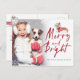 Celebre a época mágica e festiva das festas com nosso cartão-postal de fotos de feriado. Nossa design de feriado festiva mostra nossa mão puxada por um cão-solteiro vestindo um suéter festivo vermelho confortável e confortável. O cão dachshund está vestindo galhadas com uma corda de luzes de Natal embrulhadas ao redor do cão e no mês do cão. "Feliz e Brilho" exibido em um script de pincel moderno, na moda. Personalize com o nome da família e a foto. O reverso apresenta o cão de solteiro. Personalizado com seu endereço e mensagem pessoal. Todas as ilustrações contidas nesta festiva aquarela de natal dachshund cão de Natal são obras de arte originais desenhadas à mão pela Moodthology. Você pode personalizar o tamanho do texto, a cor do texto, a fonte e o layout para sua preferência de design pessoal.