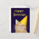 Um gato de mesa laranja num chapéu de festa com um grande cartão postal de aniversário de fotos