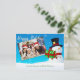Um bonitão de Natal com presentes com sua foto horizontal à esquerda. Seus nomes no fundo. Você pode personalizar a saudação de Natal, seu endereço de retorno e seus nomes no script próximo à parte inferior com espaço para adicionar uma nota pessoal manuscrita.
