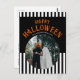 Este cartão-postal moderno e elegante é perfeito para acrescentar um toque pessoal às suas saudações de Halloween. O design apresenta um padrão de riscas preto e branco moderno com uma estrutura redonda no centro para sua foto favorita. Acima da foto, o texto cor de laranja arrojado lê "Feliz Halloween", criando um contraste impressionante. No verso, há espaço para um endereço de retorno e uma mensagem especial. Totalmente personalizável, este cartão postal combina estilo e personalização, fazer-o uma maneira divertida e única de celebrar a estação assustadora!