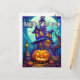 Este cartão-postal fantástico apresenta uma casa assombrada no Halloween na temporada de outono.