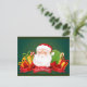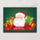 Ilustração de Papai Noel com barba branca e chapéu vermelho, cercado por presentes e canetas doces, com fundo verde e flocos de neve, e uma fita vermelha com as palavras "Feliz Natal!" em estilo de desenho animado.