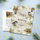 Celebre a temporada com este cartão de Natal com uma ilustração de tema de pássaros da floresta contra um fundo de madeira desgastada na frente e uma nota pessoal personalizada e sua foto no verso. Exclua facilmente essas opções. Este cartão postal certamente trará um sorriso para amigos e familiares.