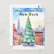 Um cartão postal festivo com uma árvore de Natal lindamente decorada na nevada cidade de Nova York, tendo o horizonte como pano de fundo. Um cartão de cumprimentos de Natal que diz “Feliz Natal de Nova York.”