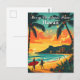 Um cartão postal festivo com um Natal tropical no Havaí com surfistas em Santa Chapéu, palmeiras e uma cena de praia de pôr do sol de ouro. Uma placa de cartões de natal divertida e exclusiva.