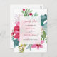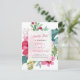 Este belo e elegante casamento de Natal ou feriado de inverno salve a data do cartão postal mostra um buquê floral de cor d'água em um fundo branco nítido. Uma mistura de flores de poinsettia, bagas ocas e folhas é colorida em tons festivos de vermelho, rosa, verde, pincel e azul. A parte de trás do cartão postal tem uma coroa floral correspondente com espaço para mais informações.