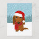 Dachshund vermelho de cabelo longo vestindo um chapéu de Papai Noel na neve de inverno. Envie os votos de boas-vindas a esta temporada de férias e mantenha a sua empresa no topo da mente. Este cartão-postal de cão de salsicha giro é perfeito para veterinários, ambulantes de cães, merceeiros de animais de estimação, creche de cão e muito mais!