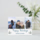Uma maneira simples de enviar suas mensagens de feriado. Esta colagem de 3 fotos é perfeita para suas fotos favoritas do ano passado. O sentimento festivo, que atualmente diz, "feriados felizes", pode ser mudado para o seu. Adicione seus nomes à frente. O inverso é onde você vai expandir seu cartões de natal. Você pode usar o fornecido ou criar o seu próprio. Para fechar, você pode alterar os nomes ou excluir o campo se preferir assiná-lo pessoalmente. Nosso designer de cartões de feriado selecionou uma fonte moderna manuscrita. Nos cantos da frente estão borras de zimbro e bagas.