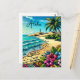 Aloha do nosso cartão postal de férias. Bonito costa tropical costeira. Bonito água azul, palmeiras, flores tropicais e um farol no fundo. Ai arte feita no estilo de pop de quadrinhos.