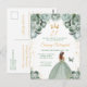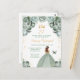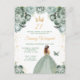 Este convite de festa de aniversário elegante e glamoroso apresenta uma bela princesa com cabelos castanhos em um vestido de baile verde sage. O texto combina caligrafia manuscrita e fontes modernas sem serifa para um visual sofisticado e elegante. Os arranjos florais, borboleta e confetes dourados criam a combinação perfeita de rústico e chique.