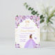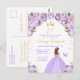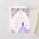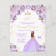 Este convite de festa de aniversário elegante e glamoroso apresenta uma bela princesa com cabelos castanhos em um vestido de baile roxo claro. O texto combina caligrafia manuscrita e fontes modernas sem serifa para um visual sofisticado e elegante. Os arranjos florais, borboleta e confetes dourados criam a combinação perfeita de rústico e chique.