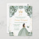 Este convite de aniversário elegante e glamoroso apresenta uma bela princesa com cabelo castanho em um vestido de baile verde salvia. O texto combina caligrafia manuscrita e fontes modernas sem serifa para um visual sofisticado e clássico. Os arranjos florais, borboleta e confetes dourados criam a combinação perfeita de rústico e chique.
