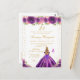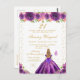 Este convite de festa de aniversário elegante e glamoroso apresenta uma bela princesa com cabelo loiro e pele clara em um vestido de baile roxo escuro. O texto combina caligrafia manuscrita e fontes modernas sem serifa para um visual sofisticado e clássico. Os arranjos florais, borboletas e confetes dourados criam a combinação perfeita de rústico e chique.