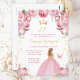 Este convite de festa de aniversário elegante e glamoroso apresenta uma bela princesa com cabelos loiros em um vestido de baile rosa corado. O texto combina caligrafia manuscrita e fontes modernas sem serifa para um visual sofisticado e clássico. As arranjos florais, borboleta e confetes dourados criam a combinação perfeita de rústico e chique.
