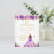Este convite de festa de aniversário elegante e glamoroso apresenta uma bela princesa com cabelos castanhos vermelhos e pele clara em um vestido roxo de baile. O texto combina caligrafia manuscrita e fontes modernas sem serifa para um visual sofisticado e elegante. Os arranjos florais, borboletas e confetes dourados criam a combinação perfeita de rústico e chique.