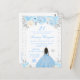 Este convite de aniversário de inverno elegante e glamoroso apresenta uma bela princesa com cabelos castanhos e pele morena em um vestido azul de baile. O texto combina caligrafia manuscrita e fontes modernas sem serifa para um visual sofisticado e clássico. Os arranjos florais, flocos de neve e confetes prateados criam a combinação perfeita de rústico e chique.