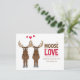 Alce caprichosa fofa dizendo "deve ser amor". Este design apresenta convites engraçados divertidos caprichosos fofos de aniversário, perfeito para festas de aniversário de casamento aniversários, uma celebração reunião divertida, um humor alce animal coração amor, citação "deve ser amor", uma tipografia única criativa legal, estilo moderno estiloso tendência estilo leve, casal marido esposa, ilustração gráfica de desenho animado vermelho com corações, cartão postal de aniversário econômico fofo
