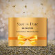 A festa de aniversário elegante, clássica, glamourosa e feminina estilo 50º (ou qualquer idade) salva o cartão postal da data. Decorado com uma fita e um arco dourados falsos. Folha de ouro escura fundo metálico. Com o texto: Salve a data na frente. Personalize e adicione a data e o nome/texto. Dica: Se você não quiser que pareça um cartão postal, clique em personalizar, vá para o verso e remova o divisor e o carimbo de posto.