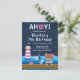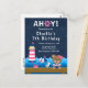 Este convite fofo e divertido apresenta uma ursa marinheira náutica em um deque de madeira com uma gaivota e um caranguejo. Ao fundo, há um farol rosa e branco, um passarinho fofo em um veleiro, ondas do oceano e um céu noturno estrelado azul marinho. O texto combina fontes em negrito e serifadas para um visual elegante e moderno. Isso é perfeito para uma festa de aniversário com tema náutico.