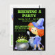 Uma bruxa engraçada, de cabeça vermelha, vestida de púrpura de seu chapéu para suas botas esquisitas (exceto suas meias riscadas) segura uma colher acima de uma caldeira fervendo com bolhas verdes. Seu gato preto olha em aprovação. Aos seus pés e aos pés do pote redondo, metálico são cogumelos coloridos. Todas as ilustrações estão em aquarela. O fundo é preto. Foi selecionada uma fonte interessante de "Olhos" para as linhas mais proeminentes do tipo, todas em um verde brilhante para combinar com o pinto da bruxa. Para a RSVP, utilizámos "Apenas Lamenta". Entretanto, se você quiser um RSVP diferente, há espaço para uma linha extra ou duas. A parte de trás é um postal típico, com seu endereço de devolução e mensagem pessoal nas mesmas fontes que o convite na frente — somente verde contra branco. Também no verso, nossa bruxa adorável está cavalgando sua vassoura acima do "gentilmente entregar a:"