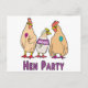 Hen Party ou Hen Night mostra três galinhas na cidade celebrando o próximo casamento. A noiva a ser veste uma coroa e um véu e seus amigos estão lá apoiando-a.