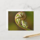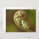 Foto de samambaia que mostra as folhas verdes de uma samambaia em uma espiral bem enrolada, prestes a se desfazer em primavera. A samambaia fica linda no início da manhã, com um primavera verde fresco no fundo.