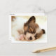 Cartão de animal mostrando um adorável cachorrinho papillon dormindo. O Papillon (a partir da palavra francesa para borboleta), também chamado de Spaniel Toy Continental, é uma raça de cão do tipo Spaniel. Uma das mais antigas dos spaniels toy, deriva seu nome de sua característica aparência de borboleta dos pelos longos e franjados nas orelhas. A pequena cabeça é ligeiramente arredondada entre as orelhas com uma parada bem definida. O focinho é um pouco curto, fino e afilado até o nariz. Os olhos escuros, de tamanho médio e redondos têm bordas pretas finas, muitas vezes se estendendo na junção das pálpebras em direção às orelhas. As orelhas grandes podem ser eretas ou caídas com pontas arredondadas. Os dentes se encontram em uma mordida de tesoura. A cauda longa é colocada alta, carregada sobre o corpo e coberta com pelos longos e finos. As unhas de orvalho às vezes são removidas. A pelagem reta, longa, fina e única tem um babado extra no peito,