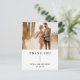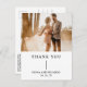 Obrigado de casamento contemporâneo e moderno, seu cartão-postal apresentando um design simples e mínimo com "Obrigado" junto com seus nomes e data de casamento em negrito com sua foto favorita. O verso tem sua mensagem personalizada. Este obrigado de casamento tipográfico preto e branco minimalista que você faz pode ser personalizado para qualquer cor que você escolher na ferramenta de edição de design.