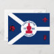 Cartão postal com pavilhão da cidade de Fort Wayne, Indiana; bandeira azul e branca e com um bloco vermelho no centro e três ilustrações no campo azul - ilustração da cabeça do Nativo Americano, do fêmur francês e do leão Britânico