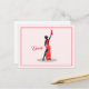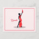 Dançarino Flamenco afligiu design em vermelho e preto. Ela está segurando um fã e parada em uma plataforma.