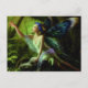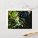 Um cartão de fantasia com uma fada de borboleta sonhadora sentada sobre uma pequena rocha na floresta mágica escura e está tentando pegar a luz.