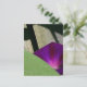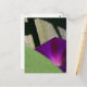A imagem no postal vertical é uma flor silvestre da Glória da Manhã rosa-púrpura sob uma folha, enquanto outras folhas lançam sombras sobre uma cerca de madeira.