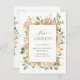 Esta maravilhosa e floral mudança de endereço que move o cartão postal de anúncio apresenta uma elegante estrutura retangular dourada cercada por lindas flores rústicas de aquarela em tons neutros e escamosos, e folhas douradas e verdes. O fundo do cartão postal é branco. A parte traseira apresenta um design floral correspondente e espaço para uma mensagem adicional. Uma bela maneira de dizer aos amigos e à família que se mudaram para um novo endereço e uma nova casa!