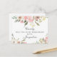 Um elegante buquê floral de peônias cor-de-rosa e rosas de marfim enquadra o topo deste maravilhoso cartão postal de verão que diz Will You Be My Bridesmaid. As manchas de sábio saem decoradas no meio do conjunto de flores de pêssego que rodeiam a bela escrita cursiva. Um belo convite personalizado para uma festa noiva.
