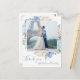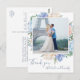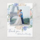 Este cartão postal de agradecimento com flores azuis empoeiradas é perfeito para um casamento de primavera ou verão. O design delicado apresenta peônias azuis claras dispostas com flores pêssego e creme em um lindo buquê e sobreposto com a foto do seu casamento. Personalize a frente do cartão com a foto e os nomes do seu casamento. Personalize o verso do cartão postal com seus nomes, seu endereço de retorno e uma mensagem de agradecimento. Alternativamente, deixe a seção de modelo de mensagem de agradecimento em branco para escrever uma nota personalizada e atenciosa à mão em cada cartão após eles chegarem.